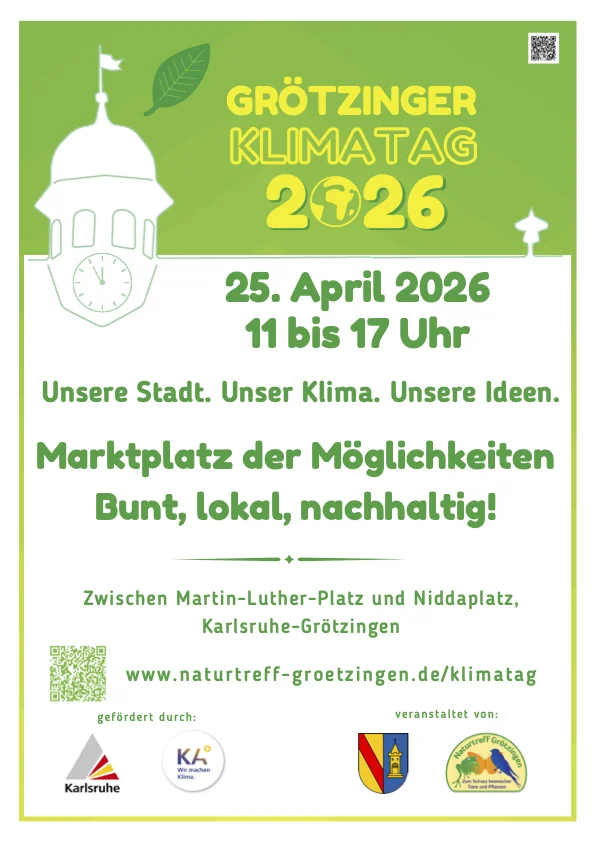 Am Samstag, den 25. April 2026, verwandelt sich die Mühlstraße in Karlsruhe-Grötzingen von 11 bis 17 Uhr wieder in eine lebendige Aktionsmeile voller Ideen für eine nachhaltige Zukunft! Der Naturtreff Grötzingen und die Ortverwaltung Grötzingen laden zum 6. Grötzinger Klimatag ein, einem bunten, vielfältigen Markt zum Staunen, Mitmachen und Vernetzen rund um die Themen Klimaschutz, Naturschutz und Nachhaltigkeit.